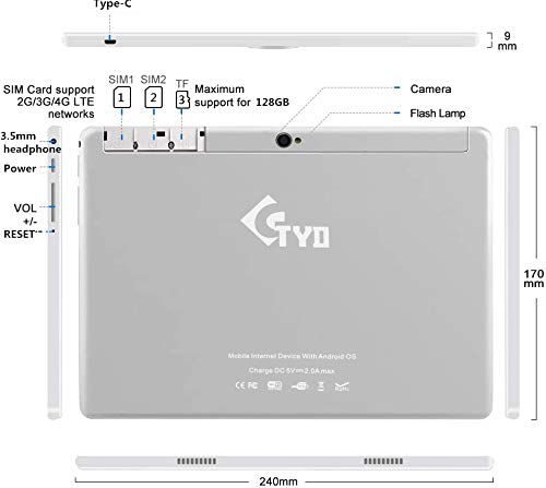 Specification: 10.1″ Zoll Tablet Deca core Android 10, 4G LTE Dual SIM,4GB RAM 64GB Speicher, 1920 * 1200 Full HD IPS Touchscreen,Dual Kamera, WiFi/WLAN/Bluetooth/GPS TYD-109 (Silbrig)